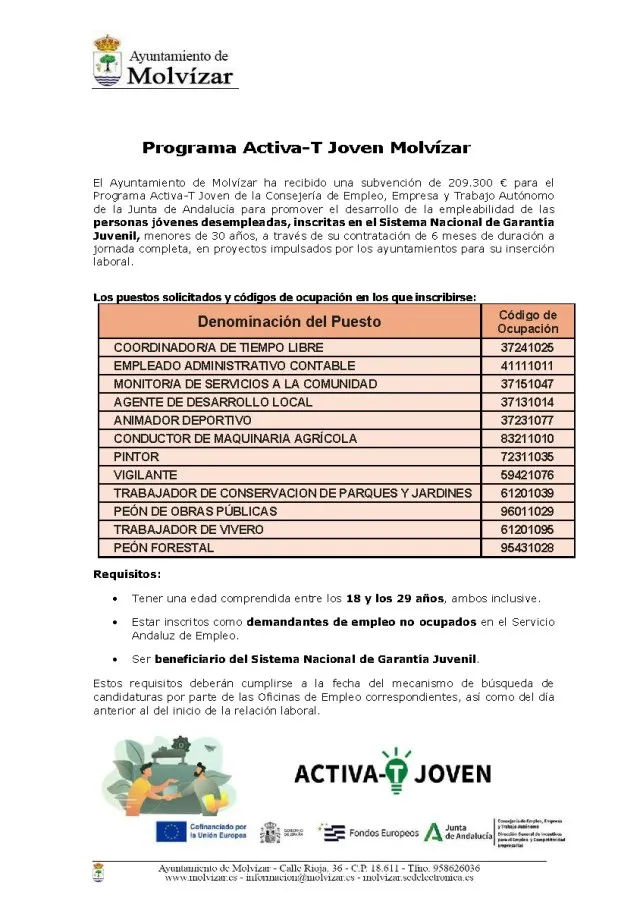 El Ayuntamiento de Molvízar pone en marcha el Programa Activa-T Joven, una iniciativa para fomentar la empleabilidad de nuestros jóvenes a través de contratos de 6 meses a jornada completa.